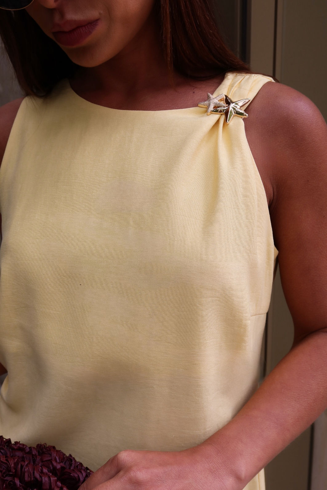 O modelo regata tem caimento mais comportado e sofisticado, mas se destaca pelo franzido assimétrico na cintura e ombro, valorizado por uma fivela dourada de metal em formato de estrela, que confere um toque moderno e exclusivo.